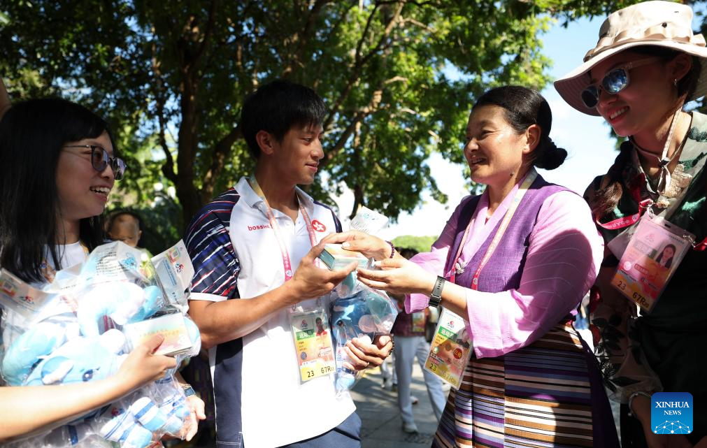 Members of delegations exchange gifts during a performance gala of the 12th National Traditional Games of Ethnic Minorities of China in Sanya, south China's Hainan Province, Nov. 26, 2024. (Xinhua/Chen Shuo)