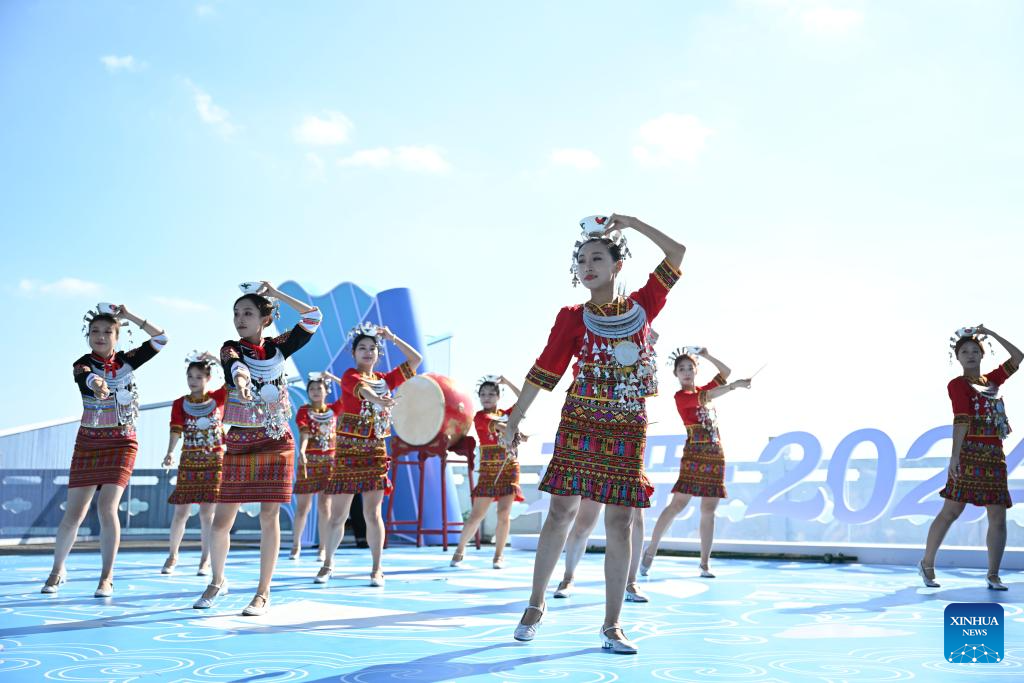 Artists welcome guests during a performance gala of the 12th National Traditional Games of Ethnic Minorities of China in Sanya, south China's Hainan Province, Nov. 26, 2024. (Xinhua/Chen Zeguo)