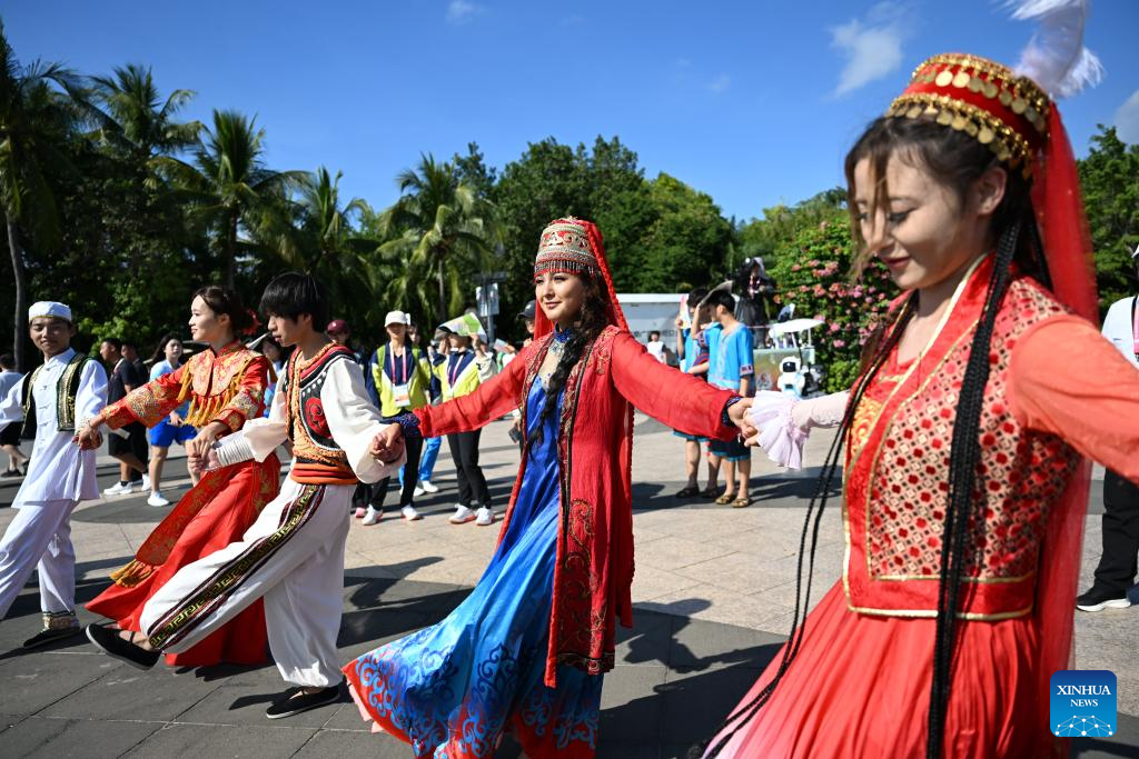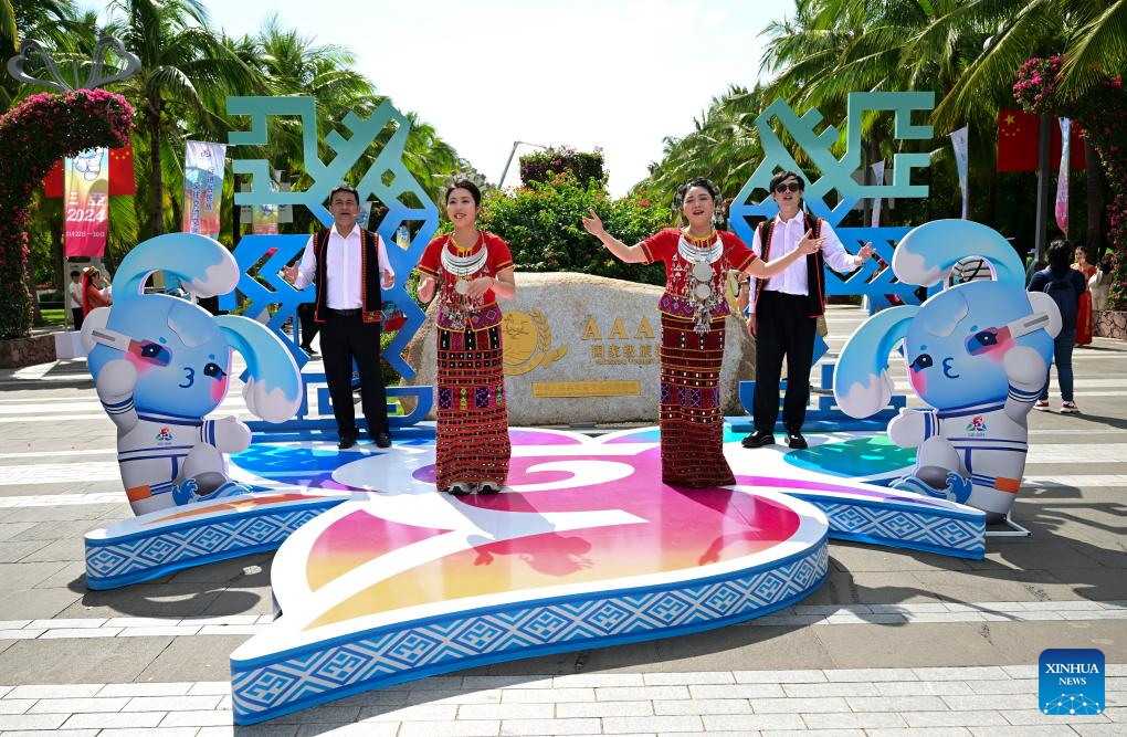 Artists welcome guests during a performance gala of the 12th National Traditional Games of Ethnic Minorities of China in Sanya, south China's Hainan Province, Nov. 26, 2024. (Xinhua/Yang Wenbin)