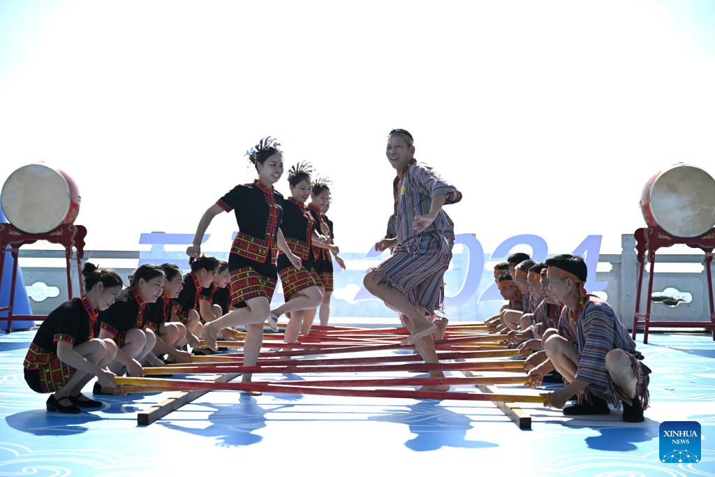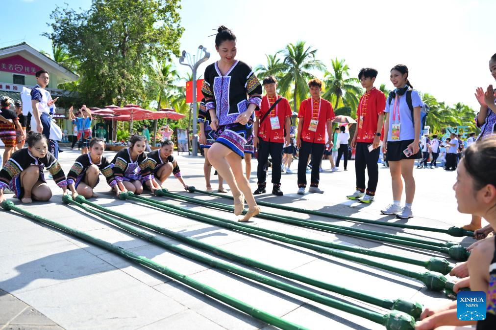 Artists perform bamboo dance during a performance gala of the 12th National Traditional Games of Ethnic Minorities of China in Sanya, south China's Hainan Province, Nov. 26, 2024. (Xinhua/Chen Zeguo)