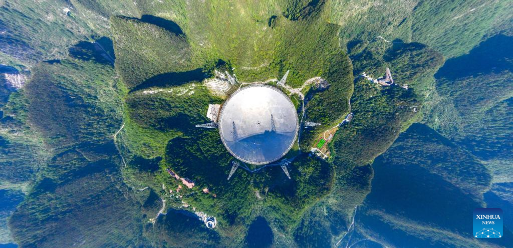A panoramic drone photo taken on Sept. 25, 2024 shows China's Five-hundred-meter Aperture Spherical Radio Telescope (FAST) under maintenance in southwest China's Guizhou Province. (Xinhua/Ou Dongqu)