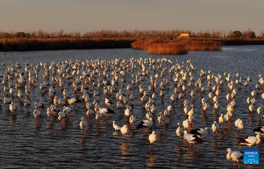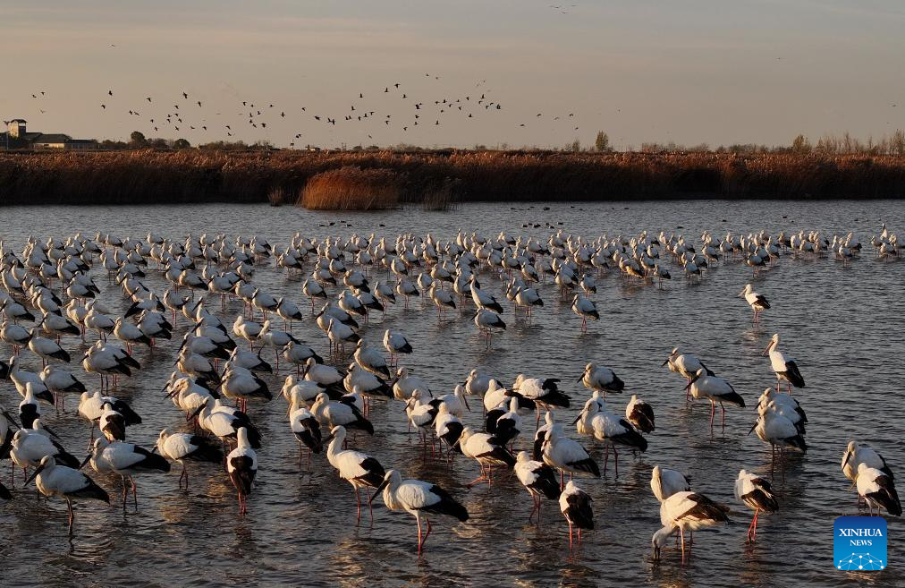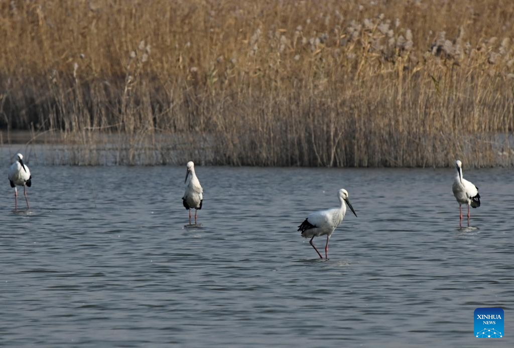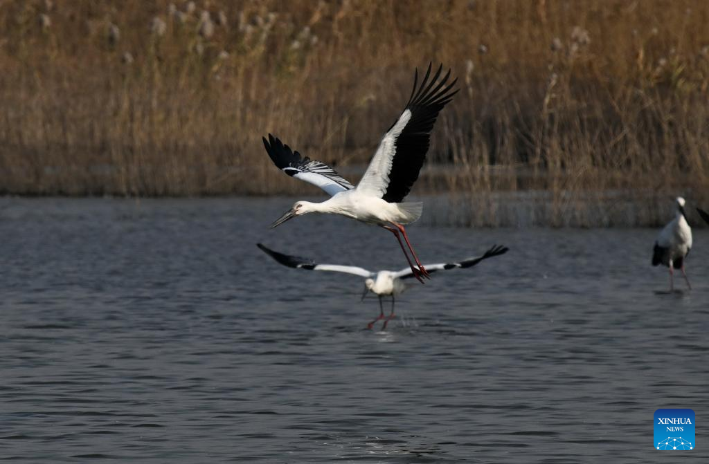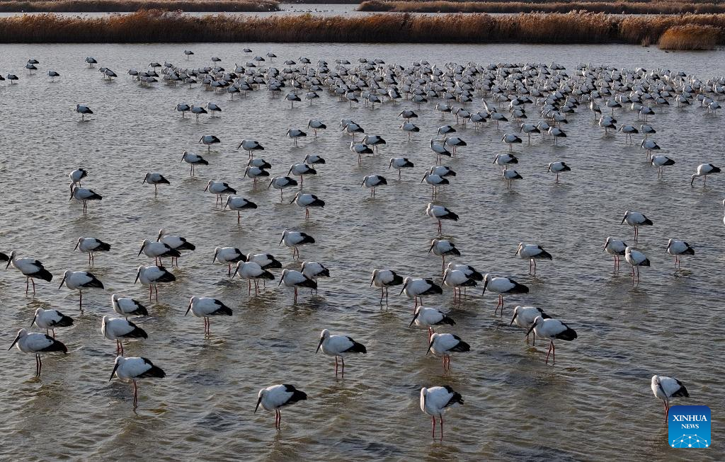 Oriental white storks are pictured at Caofeidian wetland in Tangshan, north China's Hebei Province, Nov. 26, 2024. In recent years, the recovered and improved ecosystem at Caofeidian wetland of Hebei Province has attracted many migratory birds such as the oriental white storks. (Xinhua/Yang Shiyao)