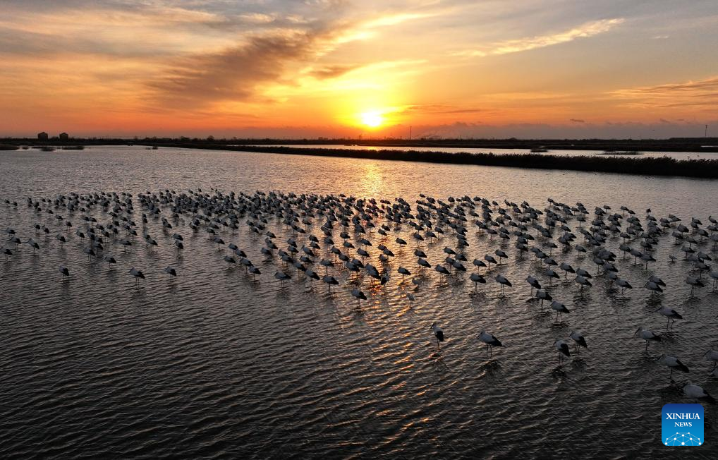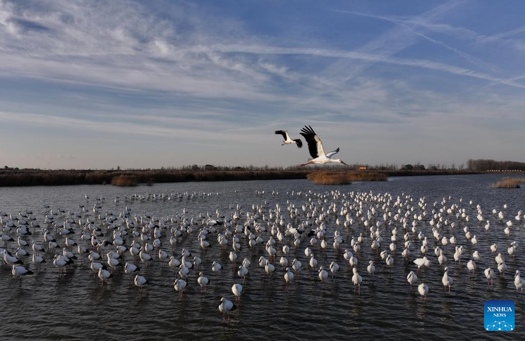 A drone photo taken on Nov. 26, 2024 shows oriental white storks at Caofeidian wetland in Tangshan, north China's Hebei Province. In recent years, the recovered and improved ecosystem at Caofeidian wetland of Hebei Province has attracted many migratory birds such as the oriental white storks. (Xinhua/Yang Shiyao)