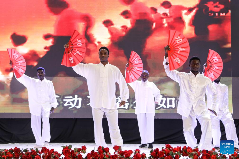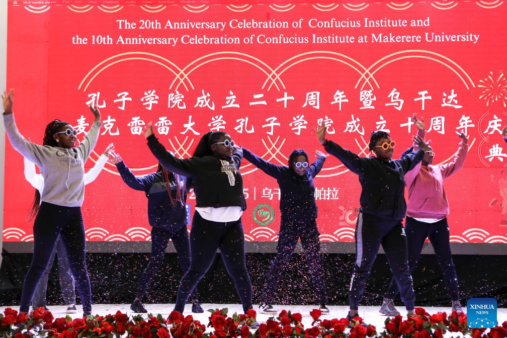 Students perform during the 10th anniversary celebration of Confucius Institute at Makerere University in Kampala, Uganda, on Nov. 25, 2024. The Confucius Institute at Makerere University, Uganda's premier institution, celebrated its 10th anniversary Monday, marking a decade of fostering cultural and linguistic exchanges between China and Uganda. (Photo by Hajarah Nalwadda/Xinhua)