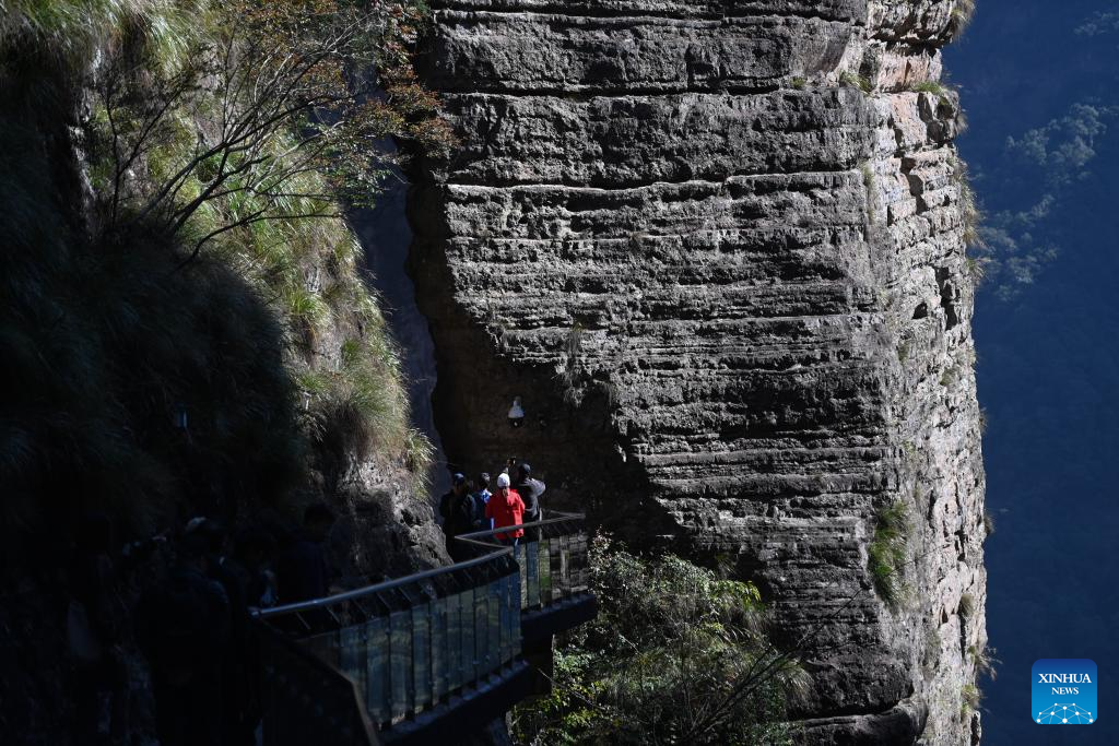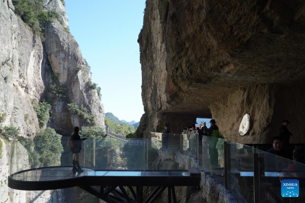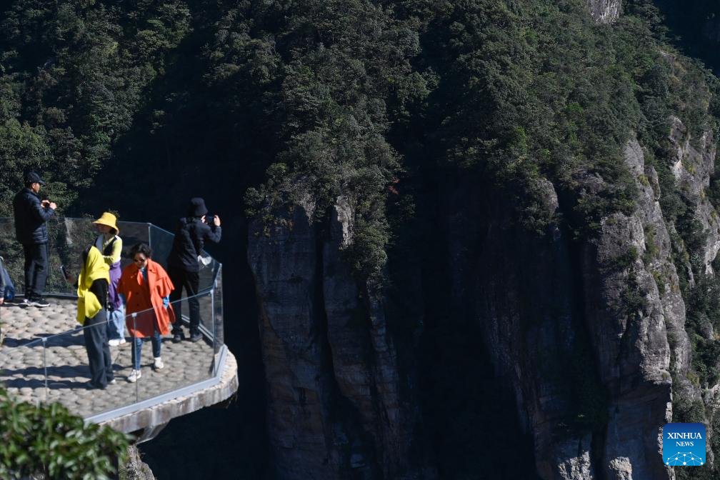 Tourists walk on a glass skywalk at Yandang Mountain scenic spot in Yueqing City, east China's Zhejiang Province, Nov. 26, 2024. Yandang Mountain is a national 5A-level scenic area, a national forest park and a UNESCO-accredited geopark. The beautiful scenery and rich historical culture there has attracted millions of visitors. (Xinhua/Huang Zongzhi)