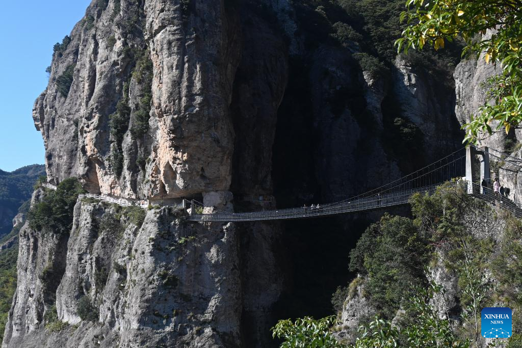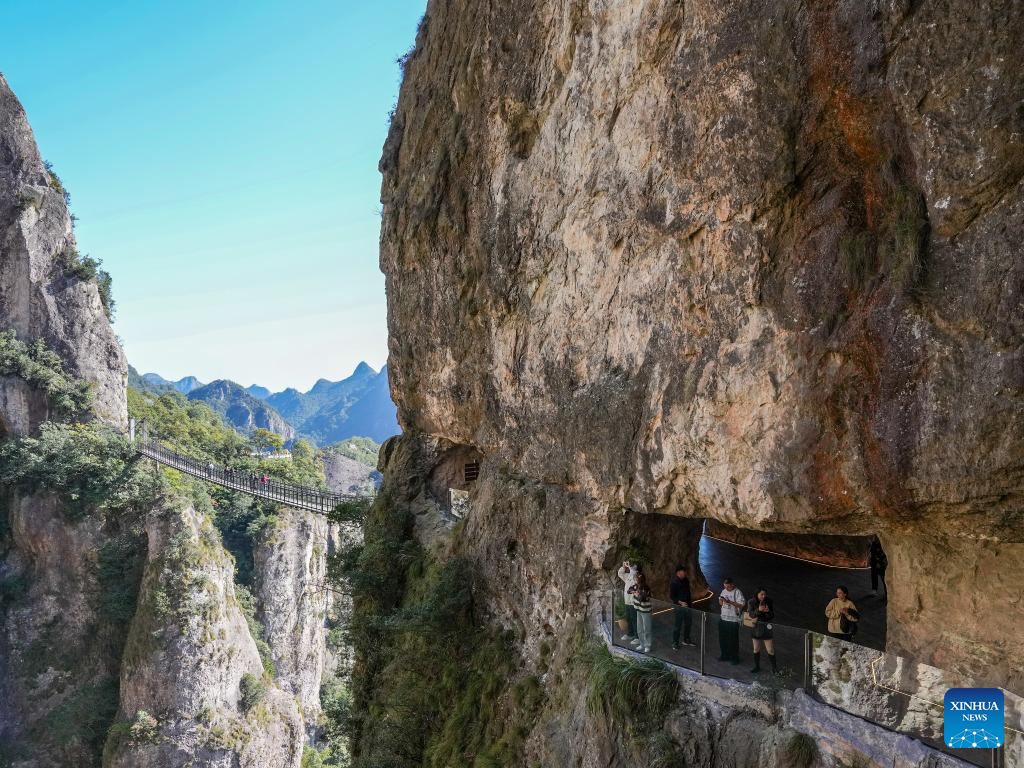 Tourists walk on a skywalk at the Yandang Mountain scenic spot in Yueqing City, east China's Zhejiang Province, Nov. 26, 2024. Yandang Mountain is a national 5A-level scenic area, a national forest park and a UNESCO-accredited geopark. The beautiful scenery and rich historical culture there has attracted millions of visitors. (Xinhua/Huang Zongzhi)