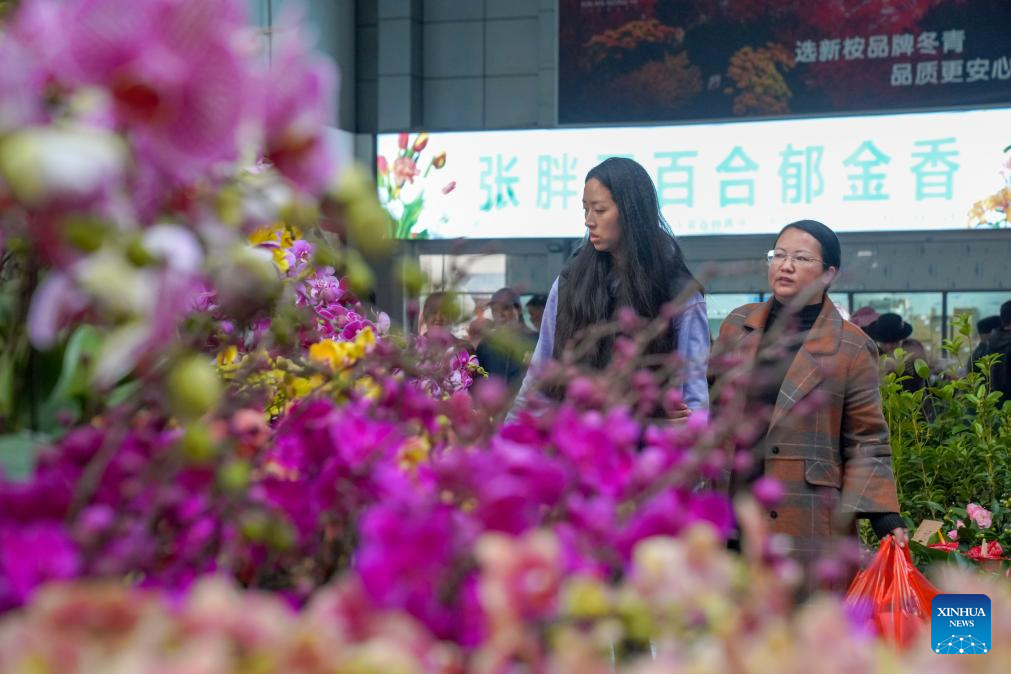 People select flowers at a market in Kunming, southwest China's Yunnan Province, Nov. 25, 2024. Yunnan, a leading supplier of flowers for lunar new year decoration, has recently witnessed the start of annual peak season. These flowers, popular around the spring festival period (usually from early December to the Lantern Festival of the next year), are not only sold across the country, but also to overseas markets such as Japan and Russia. (Photo by Peng Yikai/Xinhua)