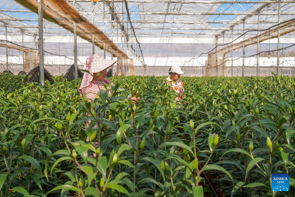Workers check the growth of flowers at a flower base in Kunming, southwest China's Yunnan Province, Nov. 25, 2024. Yunnan, a leading supplier of flowers for lunar new year decoration, has recently witnessed the start of annual peak season. These flowers, popular around the spring festival period (usually from early December to the Lantern Festival of the next year), are not only sold across the country, but also to overseas markets such as Japan and Russia. (Photo by Peng Yikai/Xinhua)