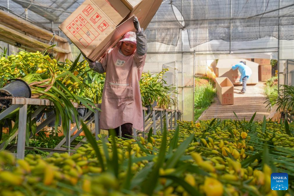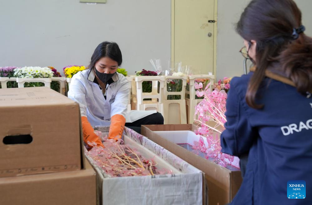 Workers pack fresh-cut flowers ready for delivery at a planting base in Kunming, southwest China's Yunnan Province, Nov. 25, 2024. Yunnan, a leading supplier of flowers for lunar new year decoration, has recently witnessed the start of annual peak season. These flowers, popular around the spring festival period (usually from early December to the Lantern Festival of the next year), are not only sold across the country, but also to overseas markets such as Japan and Russia. (Photo by Peng Yikai/Xinhua)