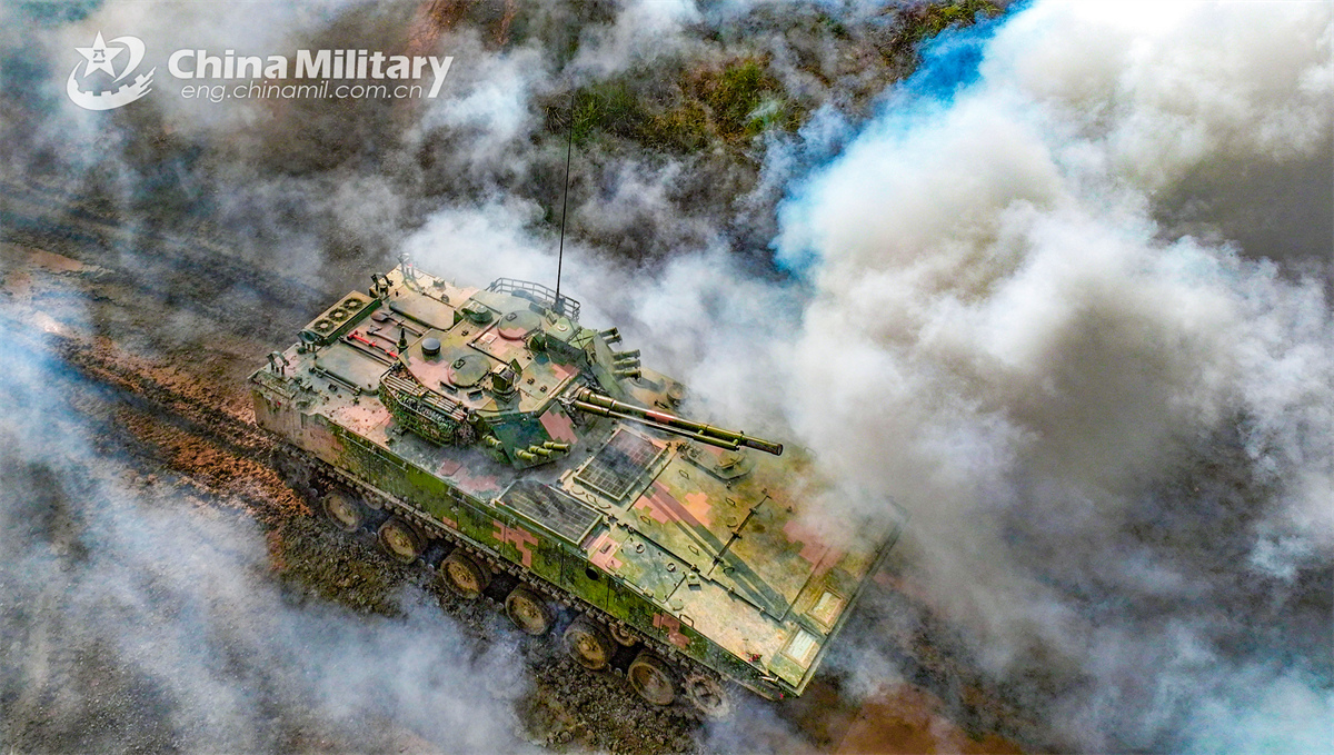 A ZBD-04A infantry fighting vehicle (IFV) attached to a brigade under the Chinese PLA 71st Group Army rumbles through smokes during a live-fire training exercise on October 25, 2024. (eng.chinamil.com.cn/Photo by Huang Zhenyu)