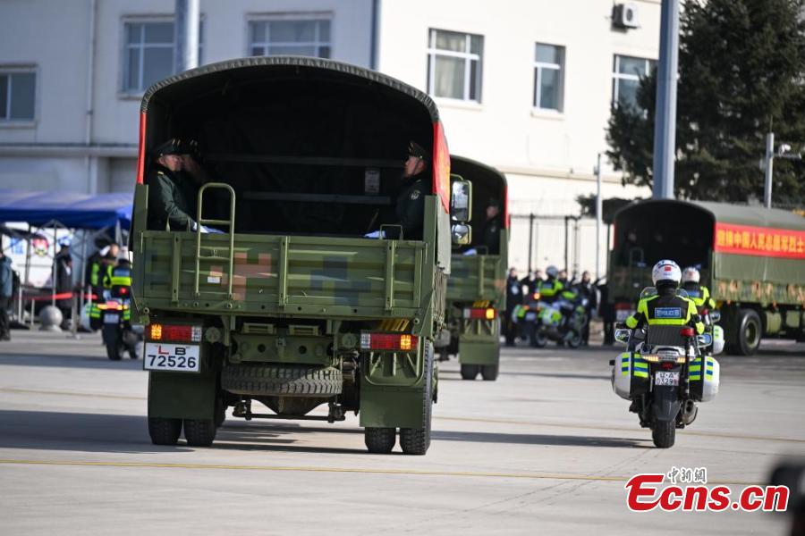 Vehicles carrying coffins containing the remains of the Chinese People's Volunteers (CPV) martyrs head to the CPV martyrs' cemetery in Shenyang, northeast China's Liaoning Province, Nov. 28, 2024. (China News Service/Yu Haiyang)