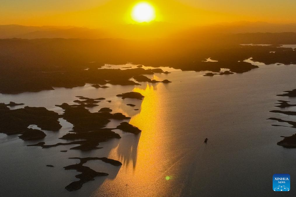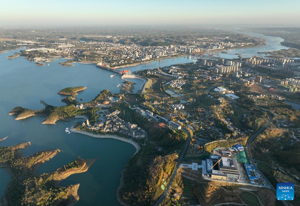An aerial drone photo taken on Nov. 29, 2024 shows a view of the Danjiangkou Reservoir in central China's Hubei Province. (Xinhua/Wang Yuguo)