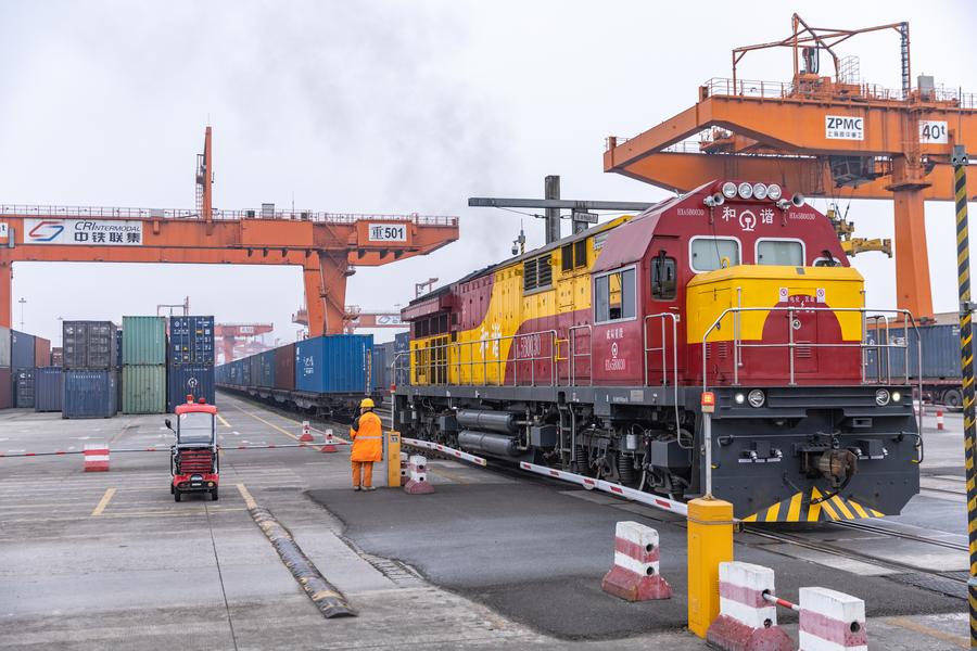 A China-Europe freight train loaded with machinery, automobiles and auto parts waits for departure at a railway station in Chongqing, southwest China, March 7, 2024. (Xinhua/Huang Wei)
