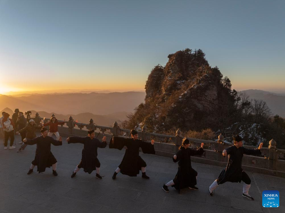 Taoist priests practice martial arts at "golden peak" on the Wudang Mountain in Shiyan City in central China's Hubei Province, Nov. 29, 2024. Tai Chi, a centuries-old Chinese martial art focusing on both internal and external practices, involves a series of slow, gentle movements and physical postures, a meditative state of mind, and controlled breathing. Statistics show that over 100 million people across more than 150 countries and regions practice Tai Chi, with about 30,000 foreigners traveling to the Wudang Mountain annually to learn and experience it. (Xinhua/Wang Yuguo)