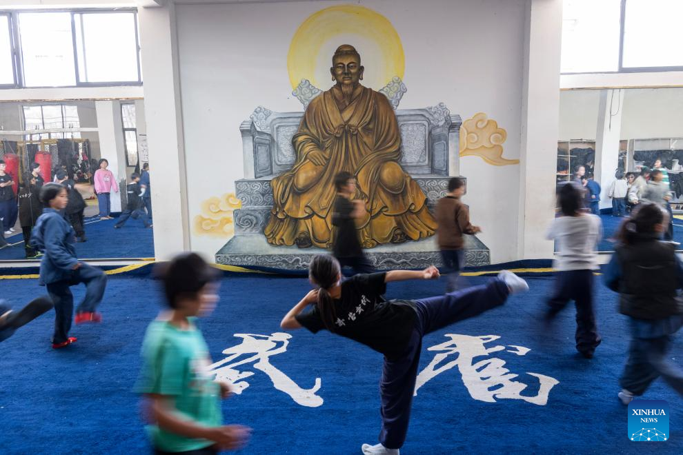 Students practice Tai Chi at a martial arts school in Shiyan City in central China's Hubei Province, Nov. 28, 2024. Tai Chi, a centuries-old Chinese martial art focusing on both internal and external practices, involves a series of slow, gentle movements and physical postures, a meditative state of mind, and controlled breathing. Statistics show that over 100 million people across more than 150 countries and regions practice Tai Chi, with about 30,000 foreigners traveling to the Wudang Mountain annually to learn and experience it. (Xinhua/Wang Yuguo)