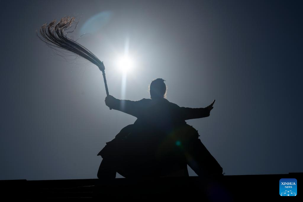 A Taoist priest practices martial arts at "golden peak" on the Wudang Mountain in Shiyan City in central China's Hubei Province, Nov. 29, 2024. Tai Chi, a centuries-old Chinese martial art focusing on both internal and external practices, involves a series of slow, gentle movements and physical postures, a meditative state of mind, and controlled breathing. Statistics show that over 100 million people across more than 150 countries and regions practice Tai Chi, with about 30,000 foreigners traveling to the Wudang Mountain annually to learn and experience it. (Xinhua/Wang Yuguo)
