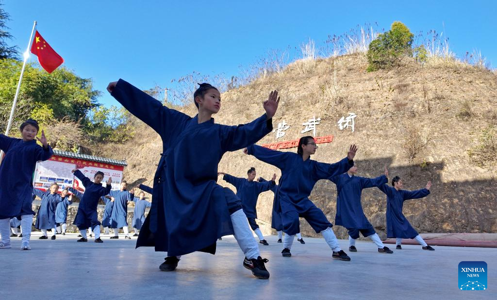 Students practice Tai Chi at a martial arts school in Shiyan City in central China's Hubei Province, Nov. 28, 2024. Tai Chi, a centuries-old Chinese martial art focusing on both internal and external practices, involves a series of slow, gentle movements and physical postures, a meditative state of mind, and controlled breathing. Statistics show that over 100 million people across more than 150 countries and regions practice Tai Chi, with about 30,000 foreigners traveling to the Wudang Mountain annually to learn and experience it. (Xinhua/Wu Zhizun)