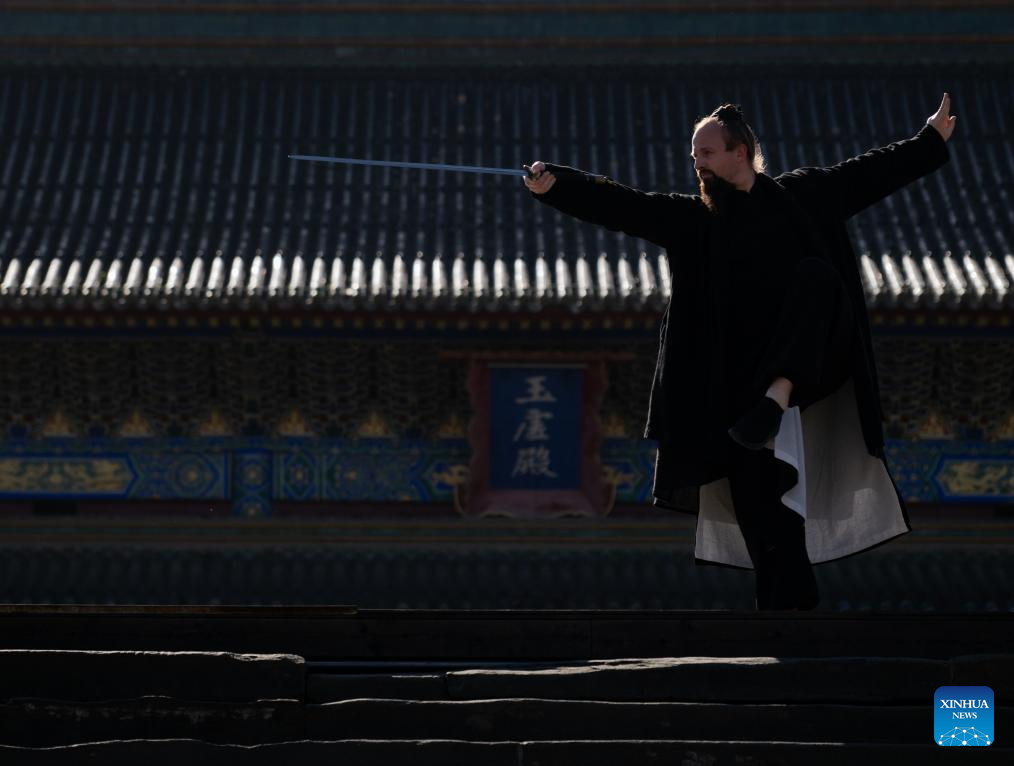 Jake Pinnick practices martial arts at Yuxu Gong Temple in Shiyan City in central China's Hubei Province, Nov. 29, 2024. An American who traveled to the Wudang Mountain to study martial arts in 2010, Jake Pinnick now serves as an instructor, imparting knowledge of Tai Chi and Chinese culture to a global audience. Tai Chi, a centuries-old Chinese martial art focusing on both internal and external practices, involves a series of slow, gentle movements and physical postures, a meditative state of mind, and controlled breathing. Statistics show that over 100 million people across more than 150 countries and regions practice Tai Chi, with about 30,000 foreigners traveling to the Wudang Mountain annually to learn and experience it. (Xinhua/Hu Jingwen)