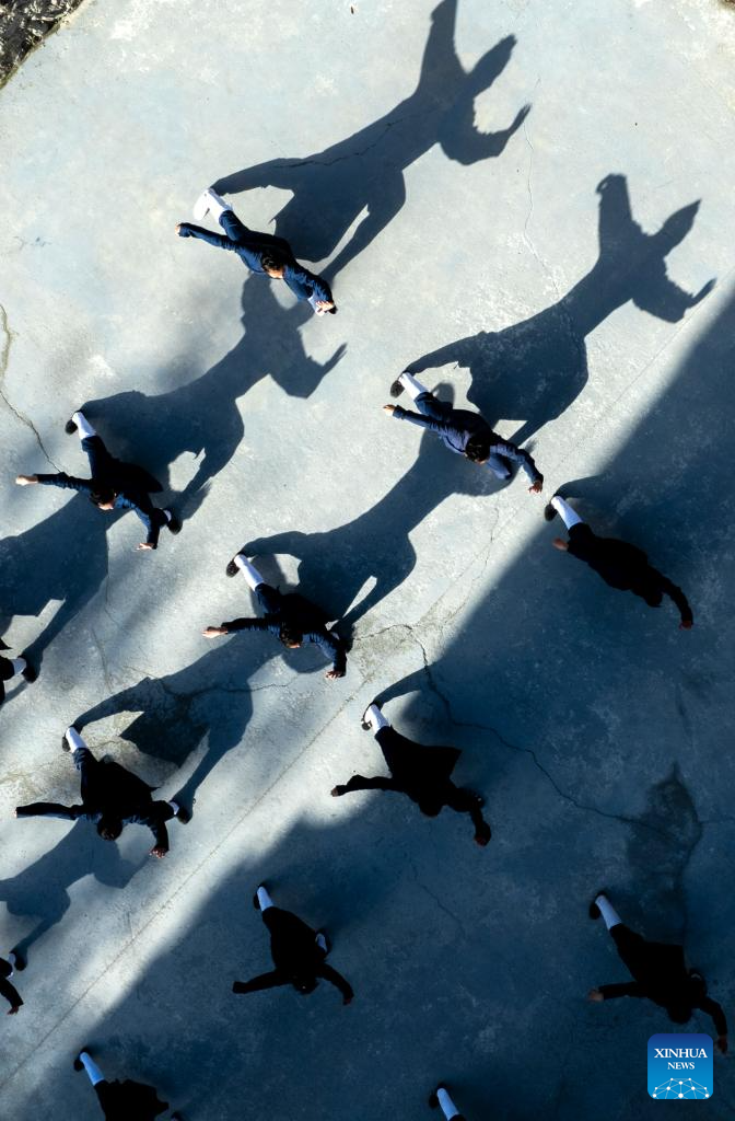 An aerial drone photo shows students practicing Tai Chi at a martial arts school in Shiyan City in central China's Hubei Province, Nov. 28, 2024. Tai Chi, a centuries-old Chinese martial art focusing on both internal and external practices, involves a series of slow, gentle movements and physical postures, a meditative state of mind, and controlled breathing. Statistics show that over 100 million people across more than 150 countries and regions practice Tai Chi, with about 30,000 foreigners traveling to the Wudang Mountain annually to learn and experience it. (Xinhua/Wu Zhizun)
