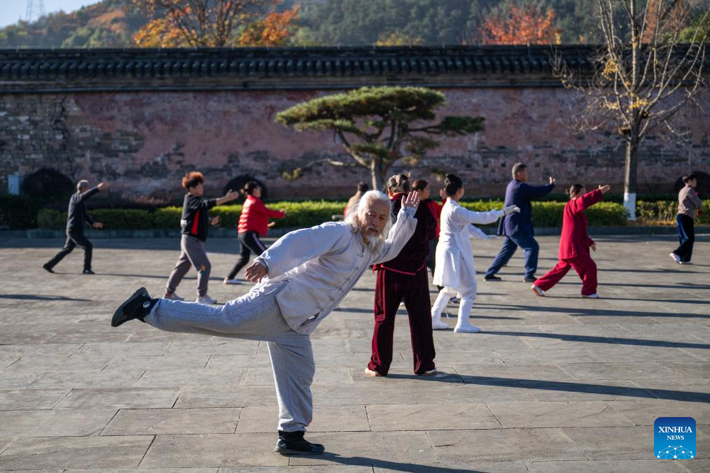 Residents do morning exercises at Yuxu Gong Temple in Shiyan City in central China's Hubei Province, Nov. 29, 2024. Tai Chi, a centuries-old Chinese martial art focusing on both internal and external practices, involves a series of slow, gentle movements and physical postures, a meditative state of mind, and controlled breathing. Statistics show that over 100 million people across more than 150 countries and regions practice Tai Chi, with about 30,000 foreigners traveling to the Wudang Mountain annually to learn and experience it. (Xinhua/Wu Zhizun)