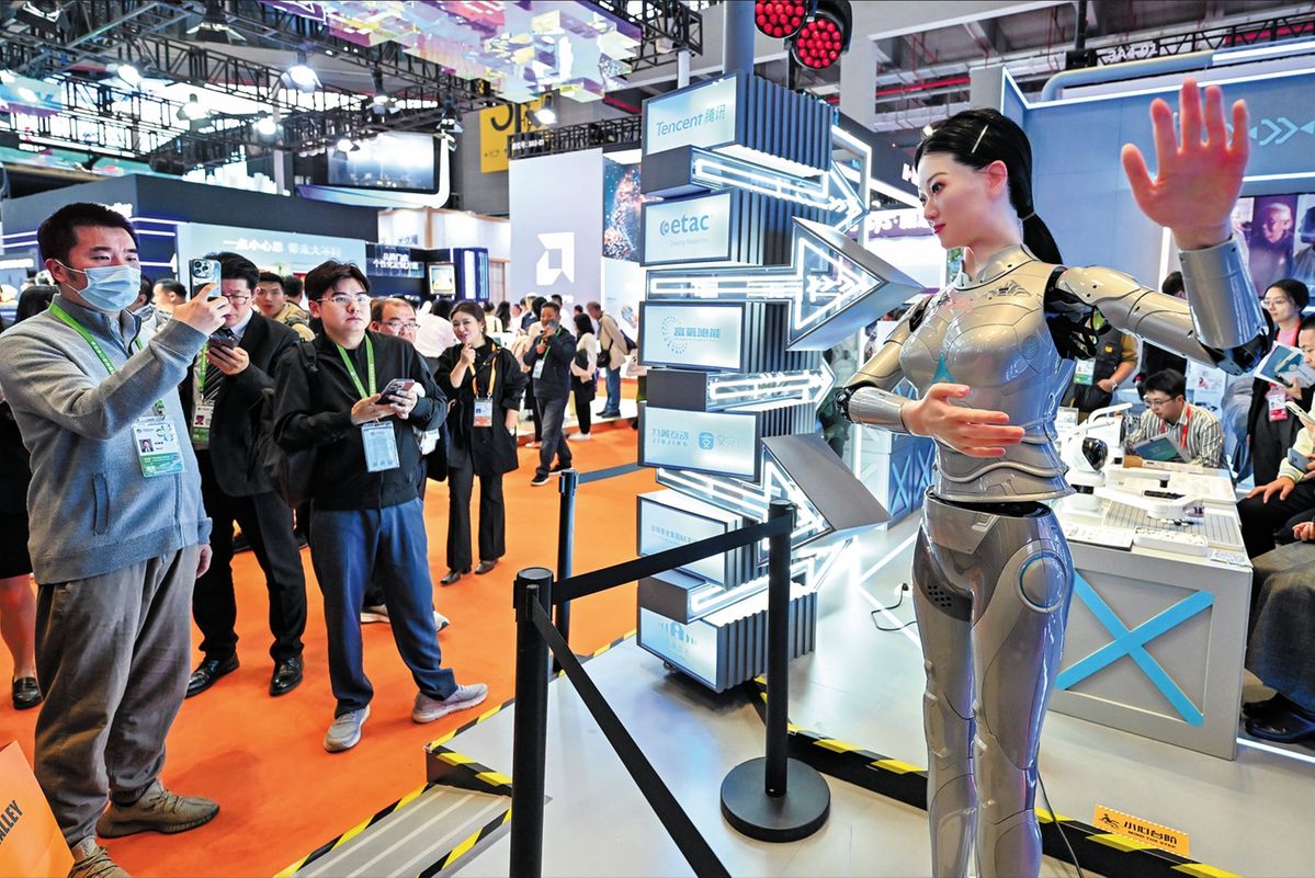 Delegates watch and take photos of a dancing humanoid robot during the seventh China International Import Expo in Shanghai on Nov 6. (ZHANG CHENG/XINHUA)