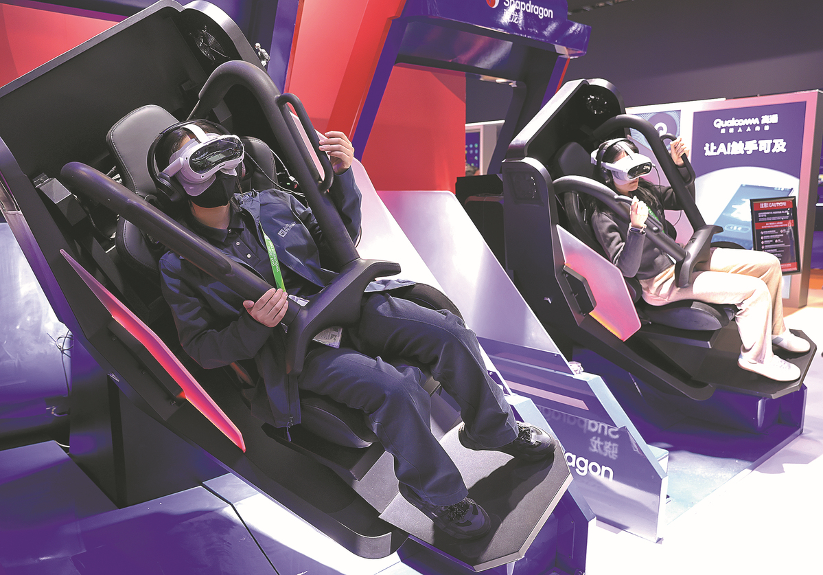 Visitors experience an immersive VR game at Qualcomm's exhibition area during the seventh CIIE in Shanghai on Nov 8. (ZOU HONG/CHINA DAILY)