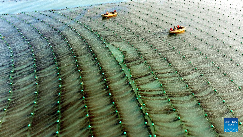 An aerial drone photo taken on Nov. 29, 2024 shows a marine ranch in Ailun Bay of Rongcheng City, east China's Shandong Province. (Photo by Yang Zhili/Xinhua)