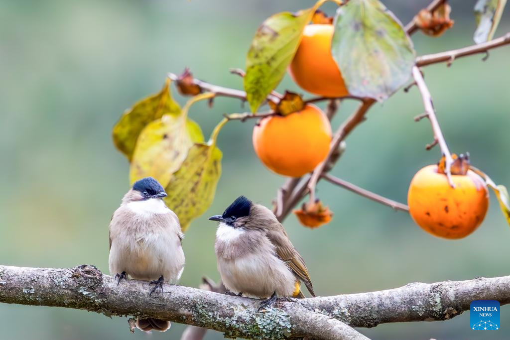 Birds rest on a persimmon tree branch in Yaowan Village of Sanquan Town, southwest China's Chongqing Municipality, Nov. 29, 2024. (Photo by Qu Mingbin/Xinhua)