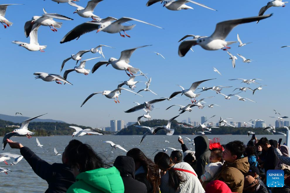People feed red-billed gulls at the Yuantouzhu scenic spot of the Taihu Lake in Wuxi, east China's Jiangsu Province, Nov. 29, 2024. (Photo by Huan Yueliang/Xinhua)