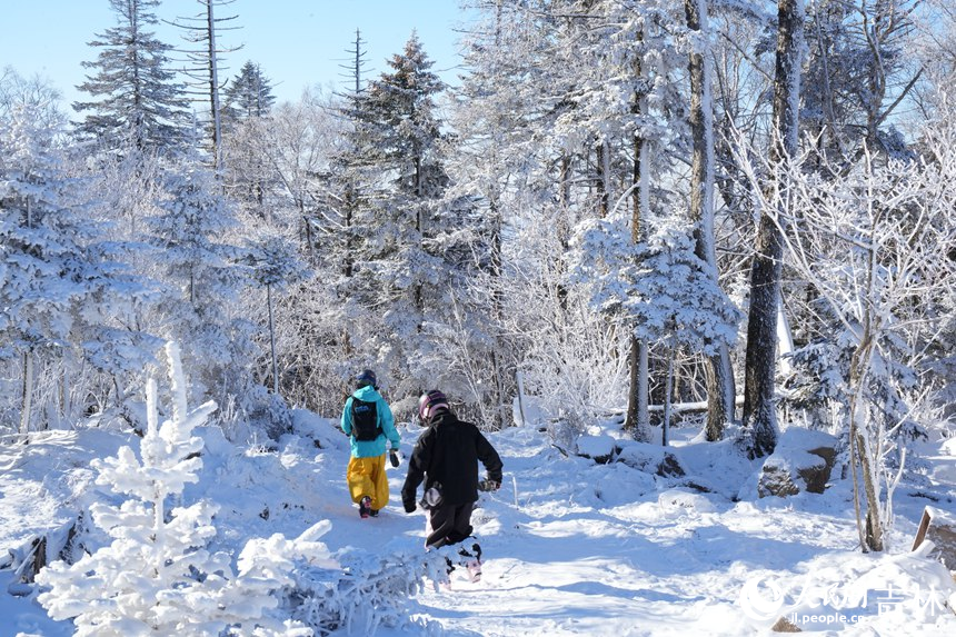 Visitors hike through the rime-covered landscape at Beidahu Ski Resort, northeast China's Jilin Province. (People's Daily Online/Li Yang)