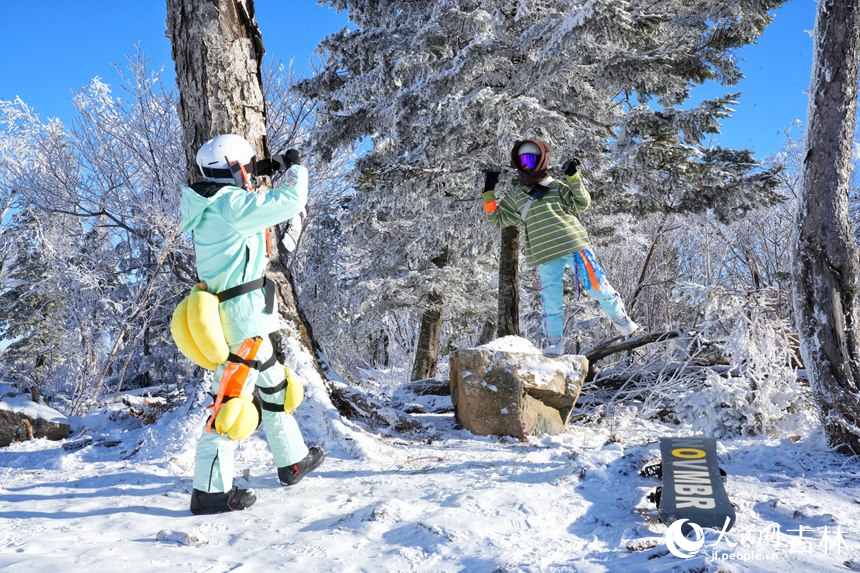 Visitors take photos near the rime-covered scenery at Beidahu Ski Resort, northeast China's Jilin Province. (People's Daily Online/Li Yang)