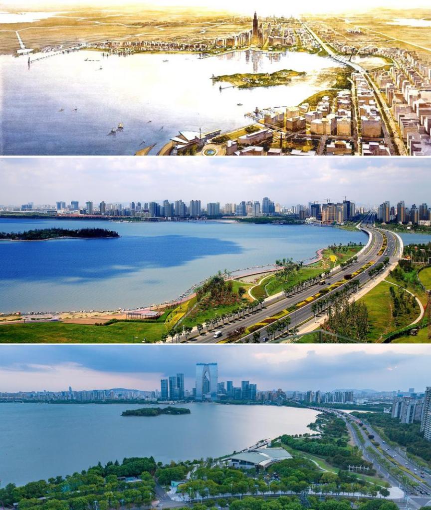 This combo photo shows a blueprint of the Suzhou Industrial Park drawn in 1994 (top), a view of the industrial park in 2012 (middle), and an aerial view of the industrial park (bottom, taken by Xinhua photographer Li Bo) on Aug. 29, 2024, in Suzhou, east China's Jiangsu Province. (Xinhua)