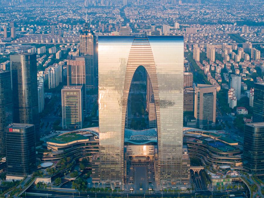 An aerial drone photo taken on Aug. 30, 2024 shows "the Gate of the Orient," a landmark complex at the Suzhou Industrial Park in Suzhou, east China's Jiangsu Province. (Xinhua/Li Bo)