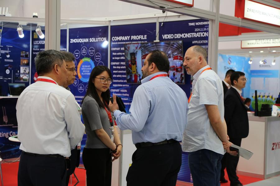 Exhibitors and buyers exchange views during the 2024 Chinese Industrial Products Exhibition held at the China-UAE Industrial Capacity Cooperation Demonstration Zone in Abu Dhabi, the United Arab Emirates, Nov. 18, 2024. (Xinhua/Wen Xinnian)