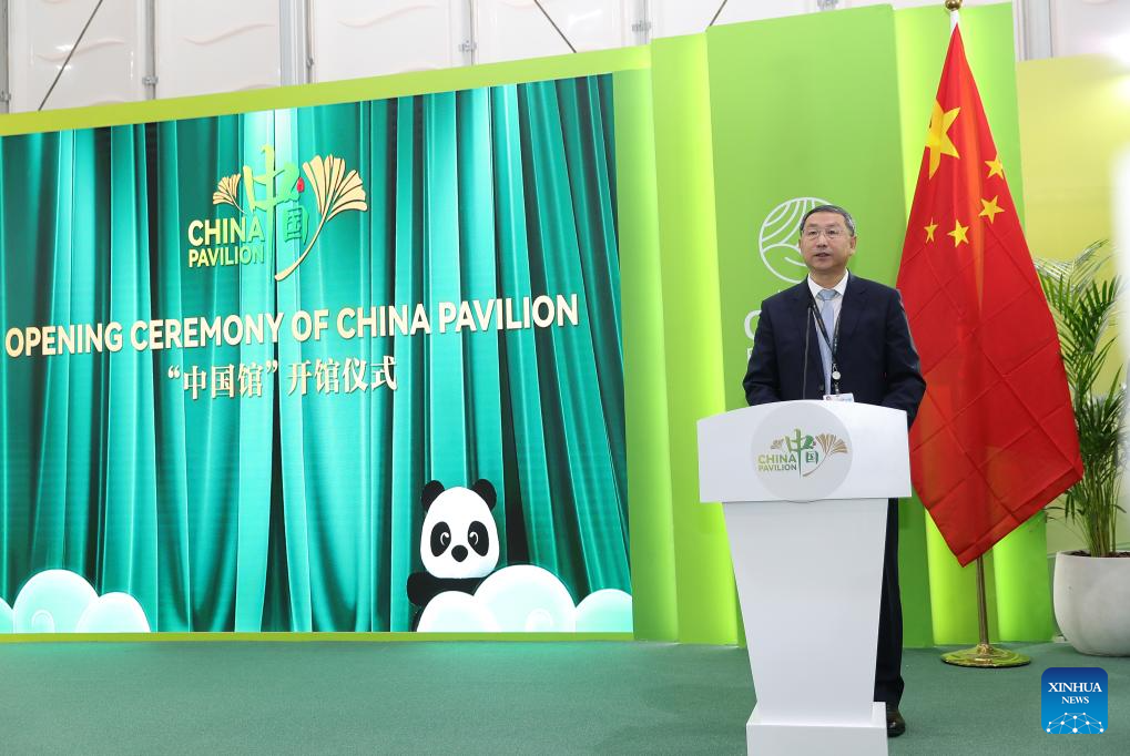 Guan Zhi'ou, head of the Chinese delegation and administrator of the National Forestry and Grassland Administration, speaks at the opening ceremony of the China Pavilion at the 16th Conference of the Parties (COP16) to the United Nations Convention to Combat Desertification (UNCCD) in Riyadh, Saudi Arabia, on Dec. 2, 2024. The China Pavilion at the 16th Conference of the Parties (COP16) to the United Nations Convention to Combat Desertification (UNCCD) officially opened on Monday, highlighting China's decades-long efforts and achievements in combating desertification. (Xinhua/Wang Dongzhen)