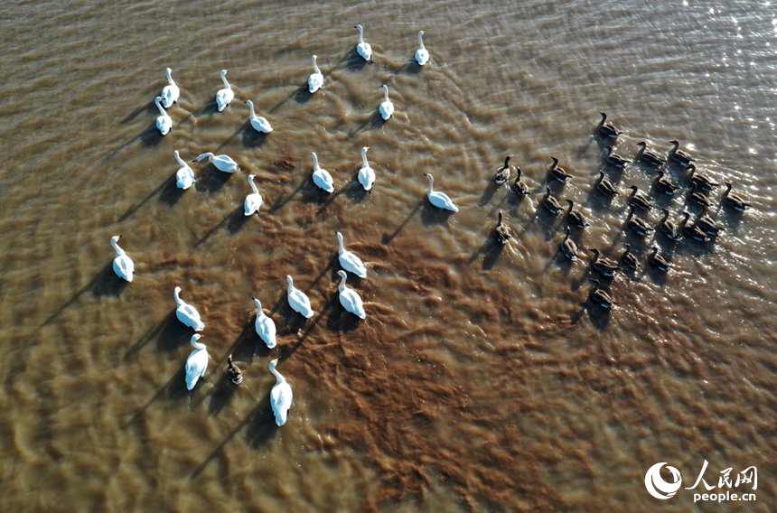 Photo shows large flocks of wintering migratory birds arriving at Poyang Lake, China's largest freshwater lake, as winter approaches. (People's Daily Online/Shi Yu)