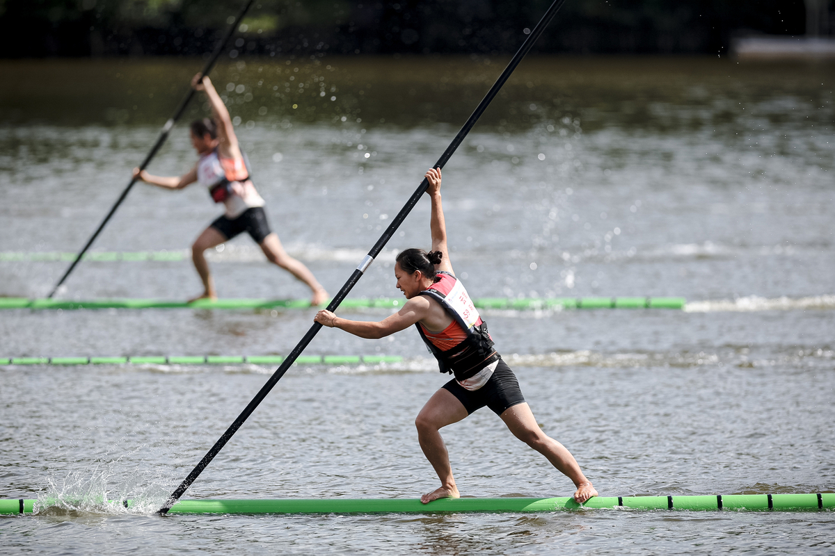 Athletes compete in the Duzhupiao (bamboo drifting) final at the 12th National Traditional Games of Ethnic Minorities of the People's Republic of China on Nov 27, 2024, in Sanya, South China's Hainan province. One stands on a single bamboo pole floating on water and uses another as a paddle to propel and steer across the water. (Photo/Xinhua)