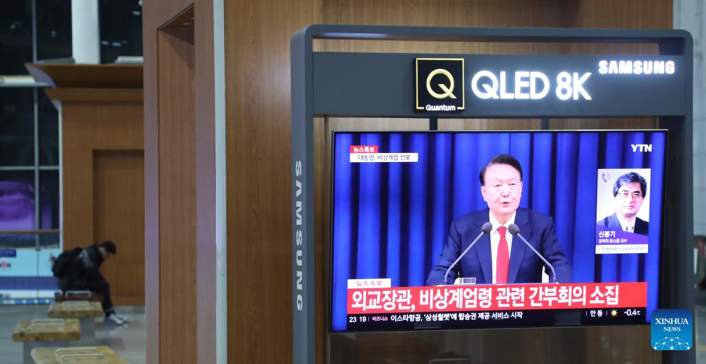 This photo taken at Seoul Station in Seoul, South Korea on Dec. 3, 2024 shows a screen displaying South Korean President Yoon Suk-yeol declaring an emergency martial law in a televised address. (Xinhua/Yao Qilin)