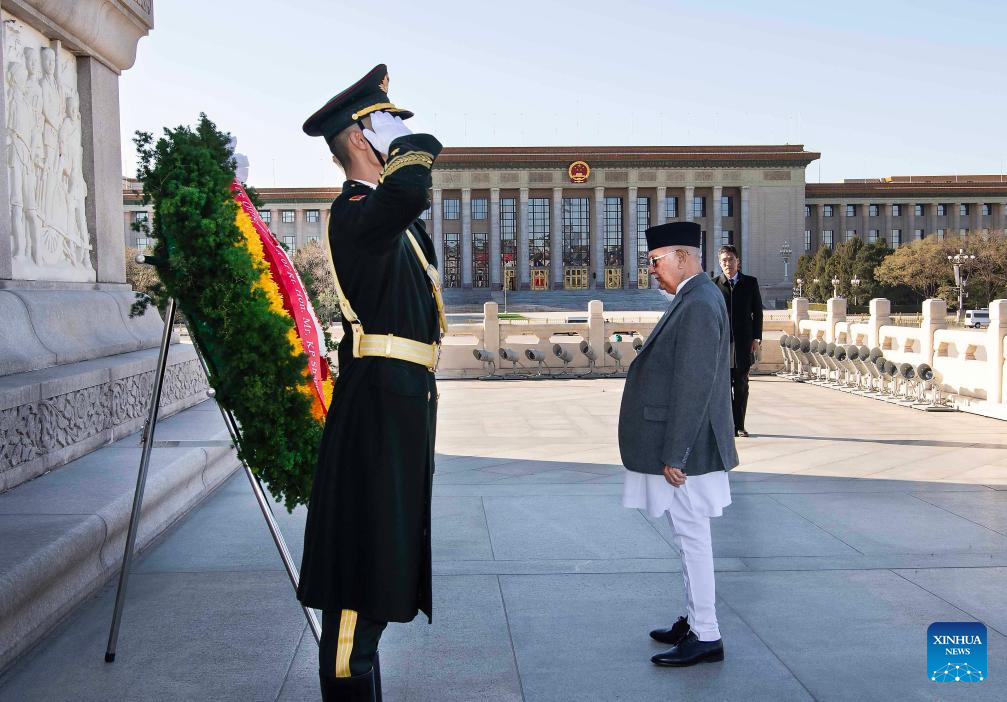 Prime Minister of Nepal KP Sharma Oli lays a wreath at the Monument to the People's Heroes on Tian'anmen Square in Beijing, capital of China, Dec. 3, 2024. (Xinhua/Li Tao)