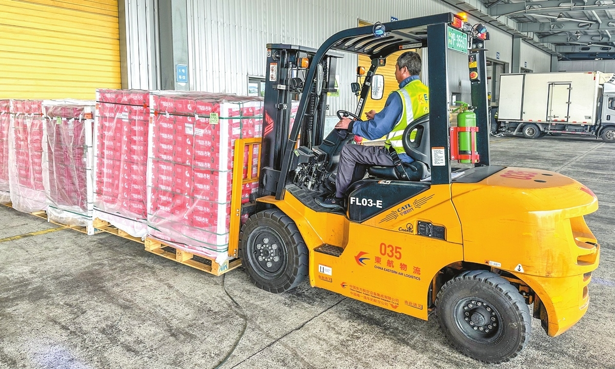 A logistics worker transports imported Chilean cherries by forklift at Shanghai Pudong International Airport on November 20, 2024. (Photo/Courtesy of China Eastern Airlines)
