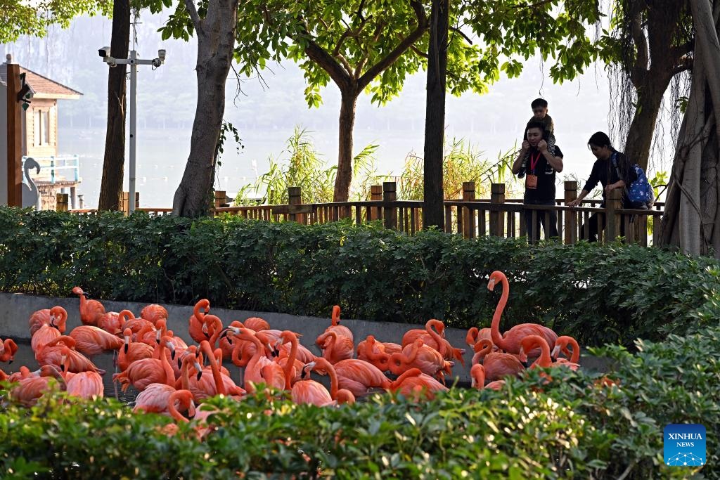 Visitors watch flamingos at a wetland park of the Xinghu Scenic Area in Zhaoqing, south China's Guangdong Province, Dec. 2, 2024.