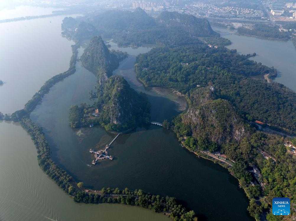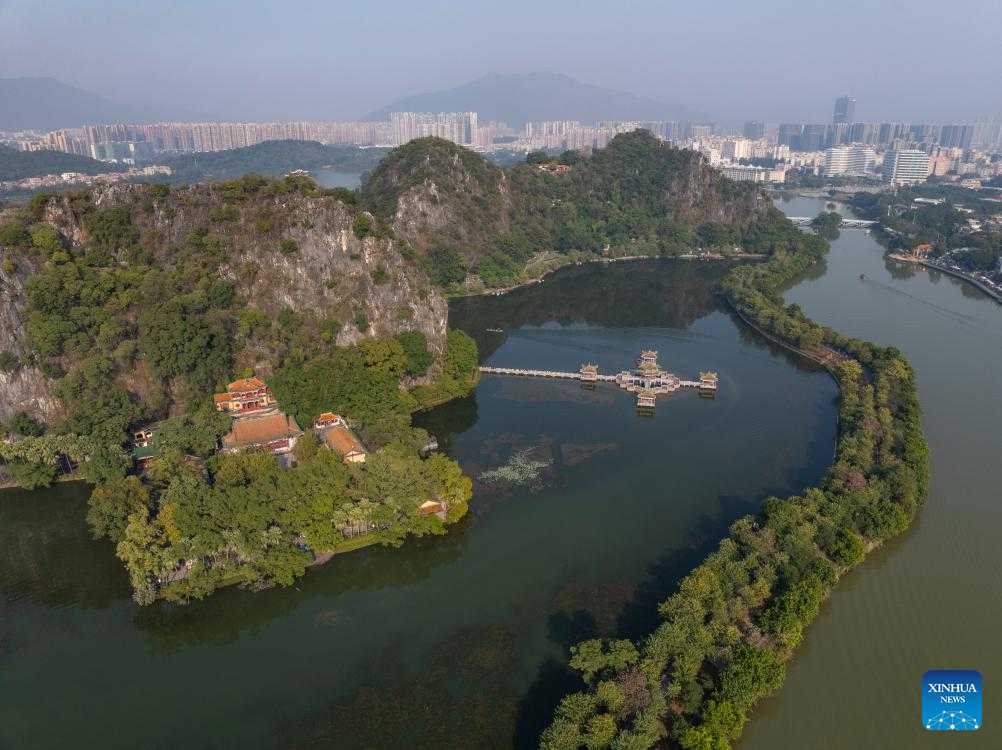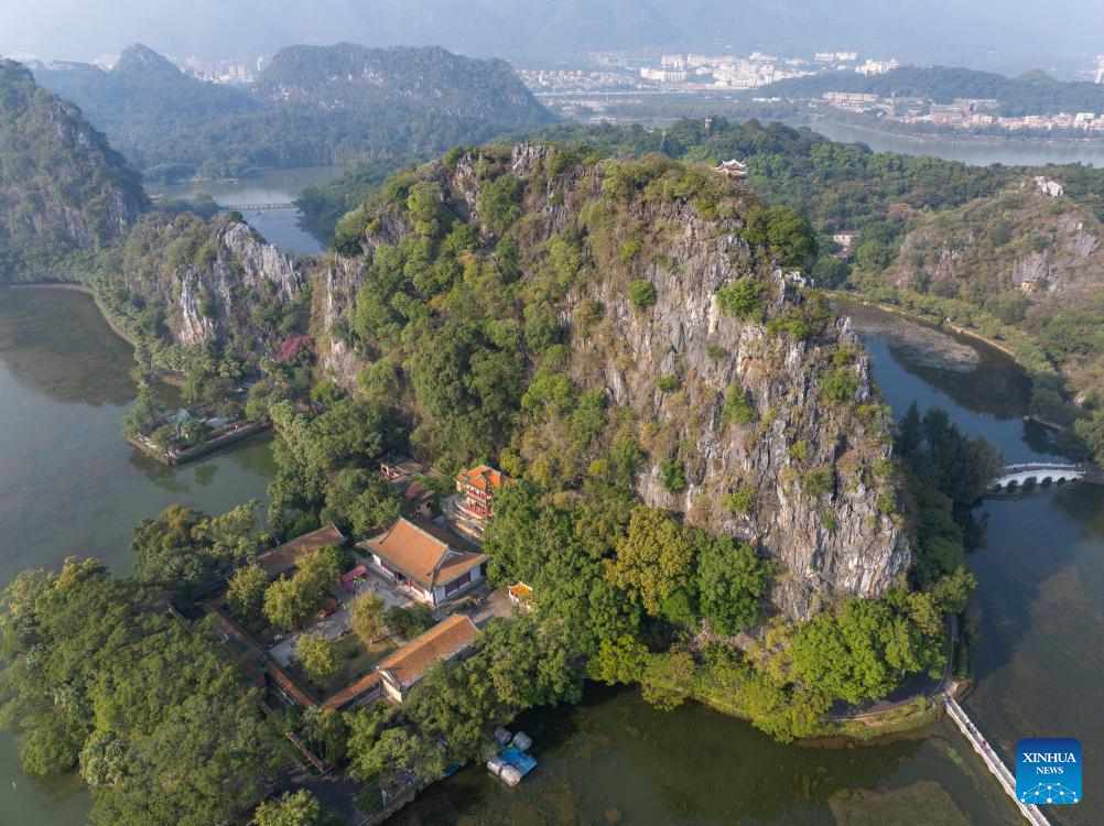 An aerial drone photo taken on Dec. 2, 2024 shows a view of the Qixingyan scenic spot of the Xinghu Scenic Area in Zhaoqing, south China's Guangdong Province.