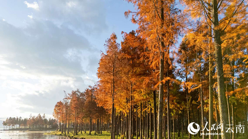 The redwood trees turn red along the shores of Erhai Lake. (Photo/Hu Juntong)