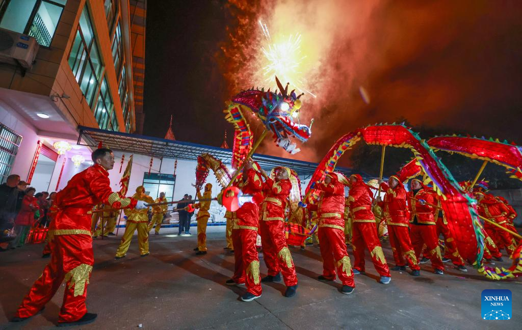 Local villagers perform dragon dance to celebrate the Spring Festival in Kuangting Village of Anhua Town in Zhuji City of east China's Zhejiang Province, Feb. 10, 2024. The United Nations Educational, Scientific and Cultural Organization (UNESCO) on Wednesday inscribed Spring Festival, social practices of the Chinese people in celebration of traditional new year on the Representative List of the Intangible Cultural Heritage of Humanity. (Xinhua/Xu Yu)