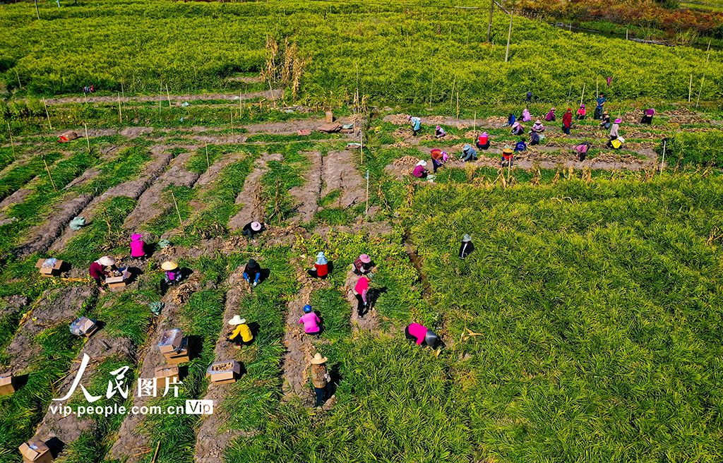 In Datang village, Xihe township, Mengshan county, south China's Guangxi Zhuang Autonomous Region, ginger farmers were busy harvesting ginger, trimming leaves, and packing them into boxes, with fields bustling with activity on Dec. 2, 2024.