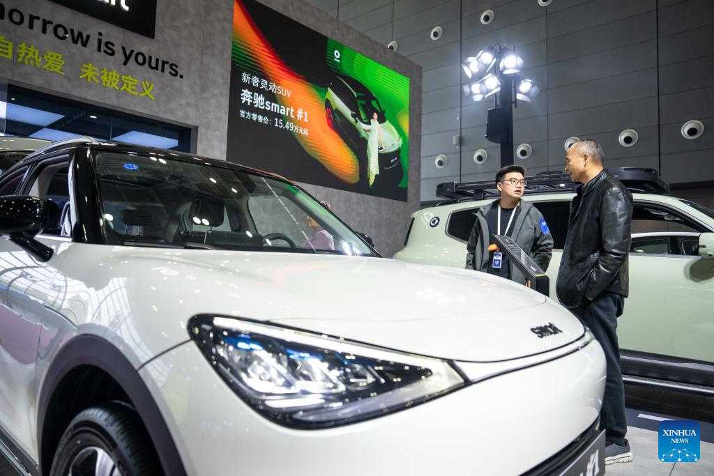 A staff member (L) introduces a car to a visitor at the 20th China (Changsha) International Automobile Exposition in Changsha, central China's Hunan Province, Dec. 4, 2024. The 6-day exposition, with an exhibition area of 120,000 square meters, kicked off on Wednesday at the Changsha International Convention and Exhibition Center, showcasing more than 1,000 vehicles from over 80 automobile brands. (Xinhua/Chen Sihan)