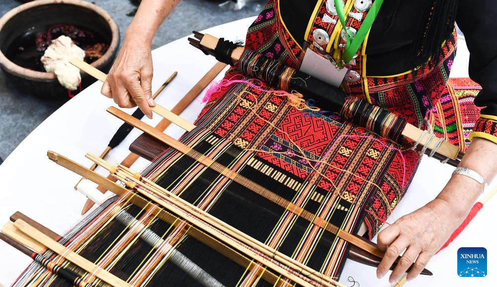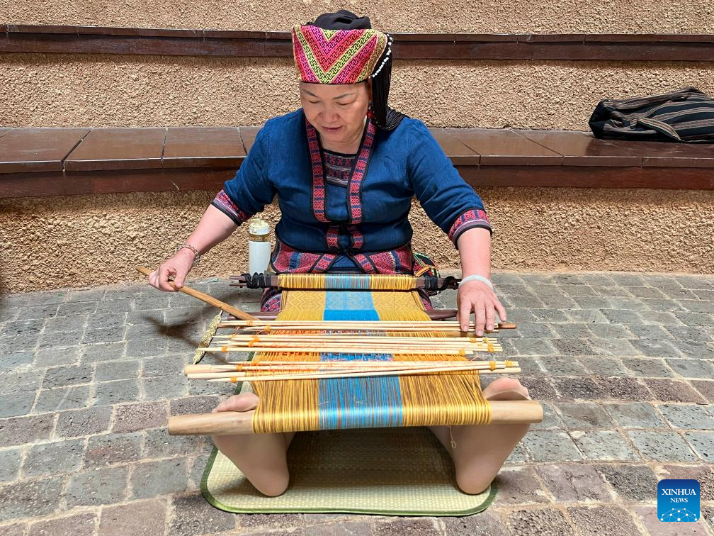 A craftswoman demonstrates Li brocade weaving techniques during an exhibition on textile techniques held in Haikou, south China's Hainan Province, April 30, 2023.?(Xinhua/Yang Guanyu)