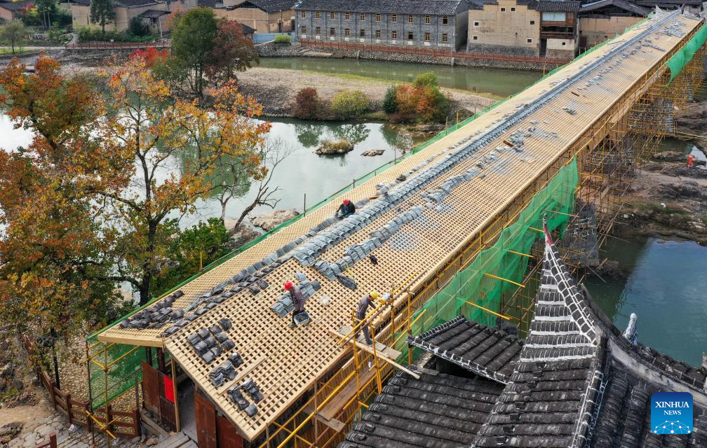 This aerial drone photo taken on Dec. 2, 2023 shows workers laying tiles on the rooftop of the Wan'an Bridge, a wooden arch bridge, in Changqiao Township of Pingnan County, southeast China's Fujian Province.?(Photo by Wang Zhiling/Xinhua)