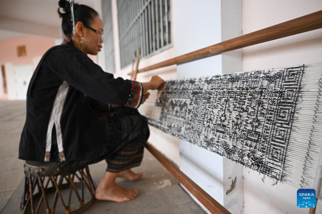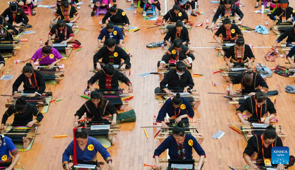 Competitors make Li brocade works during a skills competition in Ledong Li Autonomous County, south China's Hainan Province, April 23, 2023.?(Xinhua/Fan Yuqing)