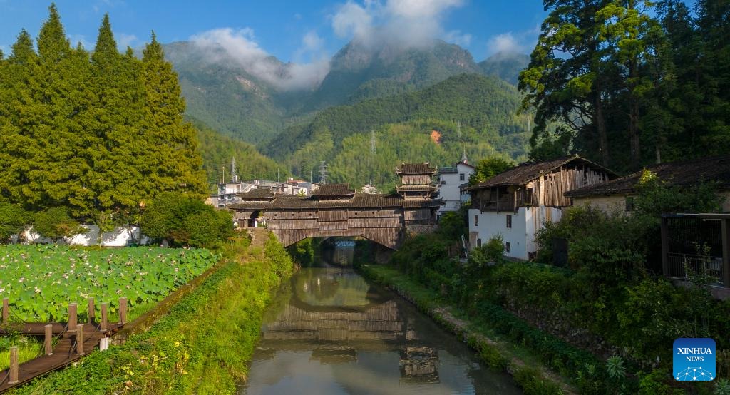A drone photo taken on Aug. 18, 2022 shows the Rulong Bridge, a wooden arch bridge, in Qingyuan County of Lishui City, east China's Zhejiang Province.?(Photo by Wu Chunping/Xinhua)